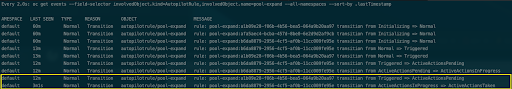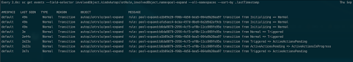 oc get events --field-selector involvedObject.kind=AutopilotRule,involvedObject.name=pool-expand --all-namespaces --sort-by .lastTimestamp Every 2.0s: oc get events --field-selector involvedObject.kind=AutopilotRule,involvedObject.name=pool-expand --all-namespaces --sort-by .lastTimestamp Thu Sep 9 11:07:23 2021 NAMESPACE LAST SEEN TYPE REASON OBJECT MESSAGE default 7m51s Normal Transition autopilotrule/pool-expand rule: pool-expand:a1b09e28-f06b-4b56-bea5-064a9b20aa97 transition from Initializing => Normal default 7m51s Normal Transition autopilotrule/pool-expand rule: pool-expand:afa5aec4-bcba-457d-8be0-6e2d9d2af9cb transition from Initializing => Normal default 7m51s Normal Transition autopilotrule/pool-expand rule: pool-expand:b6da8879-2956-4cf5-af0b-11cc009fe95e transition from Initializing => Normal