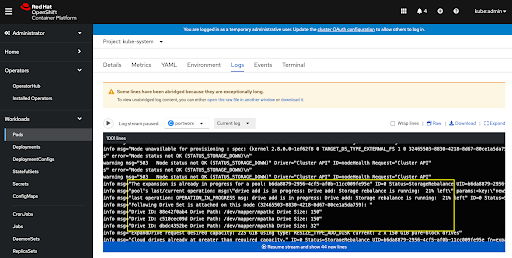To check the progress of the pool expansion, you can look at the nodes’ Portworx logs and make note of the “Expansion is already in progress for pool” log entries and the percentage that the expansion has left to rebalance.