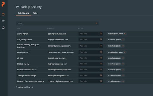 - px-backup-infra.admin: Infrastructure owner with admin privileges for all PX-Backup objects
