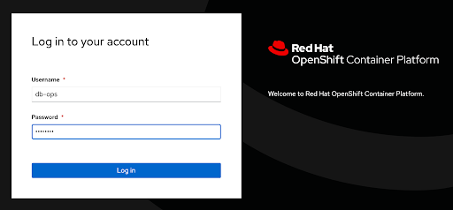 Once the administrative tasks are complete, users—such as the “db-ops” user below—may sign into both the Red Hat console and the PX-Backup console. Note: If Red Hat OpenShift imports the same users as PX-Backup, users can log in using the same credentials.