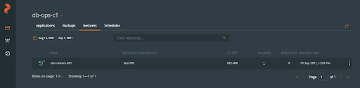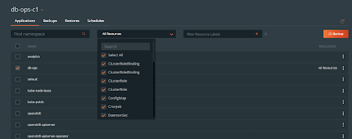 From the “Applications” tab, the db-ops user can filter by resource or tag to backup the entire db-ops namespace or specific resources within it.