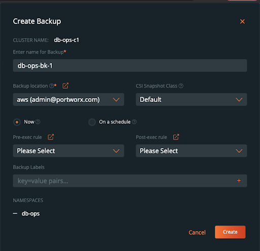 PX-Backup users will not be able to create backups for other namespaces or resources within the RedHat OpenShift cluster they do not have access to. The example below shows the error the “db-ops” user would see if they tried to backup resources from the “analytics” namespace, which they do not have access to.