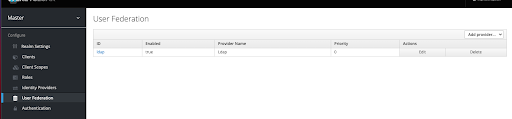 Head to the “User Federation” section on the left-hand menu. From here, you can “Add Provider” and choose “ldap”.
