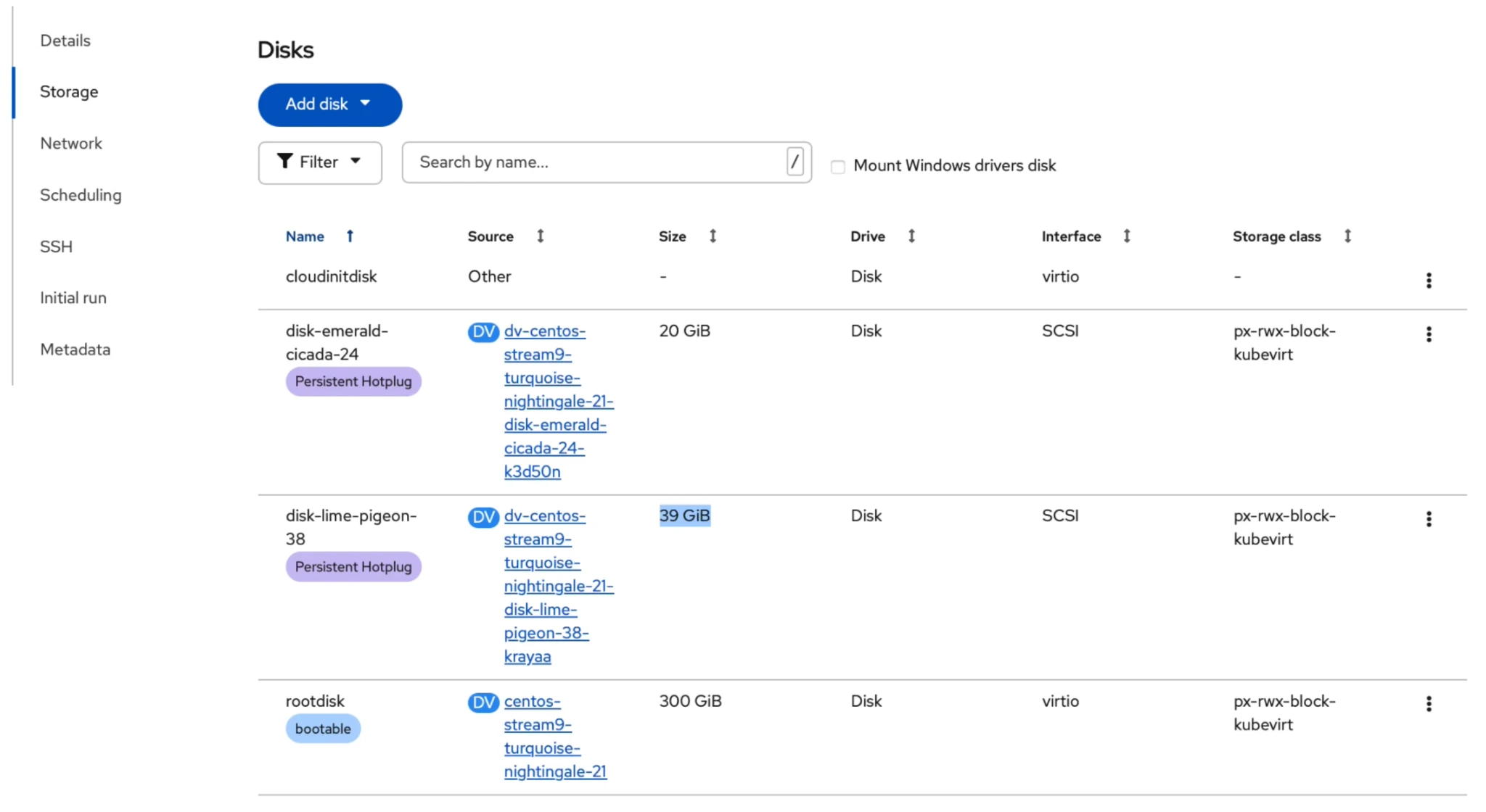 PVC and VM disk size (/dev/sdb) of the VM before the AutopilotRule event