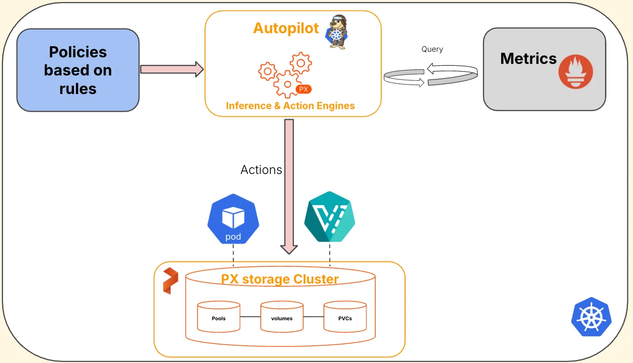 • StorageCluster integration: Autopilot is enabled and configured through the Portworx StorageCluster, including settings like the metrics endpoint and operational options.