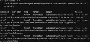 Containers: Autopilot detects the threshold breach, triggers the resize action, and you can clearly show the before/after PVC size along with the rule status / events that indicate an action was executed.