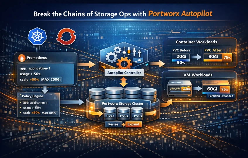 Persistent data rarely fails loudly, it creeps up. A database volume nears capacity, a VM disk expands unexpectedly, and the “fix” turns into a ticket and an approval. Suddenly, your self-healing platform is blocked by a manual step. Portworx Autopilot by Pure Storage was built to break this loop by turning PVC growth into policy.
