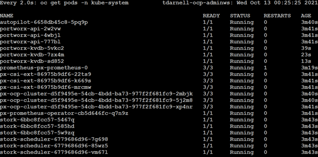 We can monitor the installation status of Portworx by watching the pods in the kube-system namespace and waiting until they are all ready by issuing the command watch oc get pods -n kube-system: