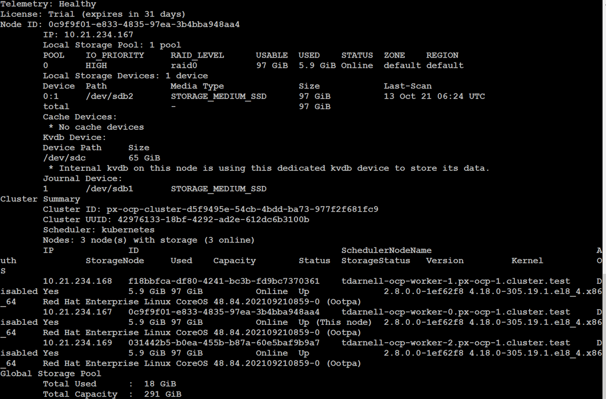 We can also verify our Portworx cluster health by running pxctl status from within one of the OpenShift worker nodes where Portworx is installed: