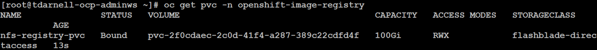 We can now issue the command oc get pvc -n openshift-image-registry to verify that we have a bound PVC that has been provisioned on the FlashBlade through Portworx: