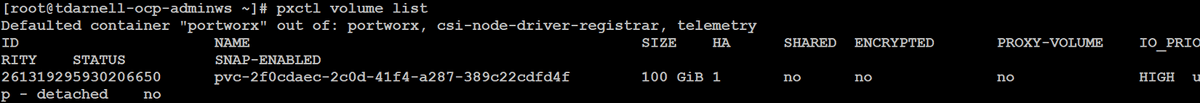 And we can also check the volume in Portworx by issuing the command pxctl volume list from one of the worker nodes: