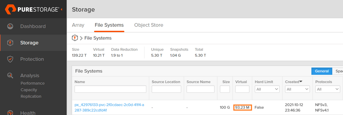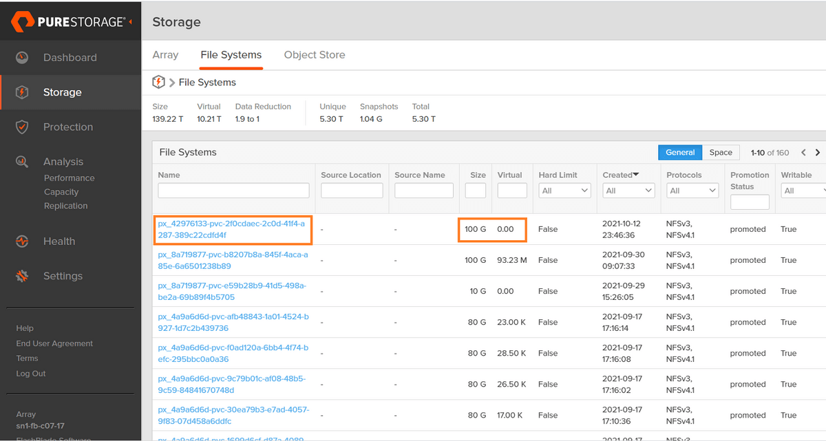 We can take a look at the resultant filesystem if we login to our FlashBlade and sort by creation date to find our NFS filesystem. We can see that there is a 100G filesystem with zero bytes consumed, and that the PV ID is appended to the filesystem name so we can easily map back our filesystem from the FlashBlade UI to our PV inside of OpenShift:
