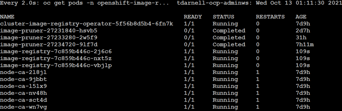 We can monitor the status of the image registry pods by issuing the command watch oc get pods -n openshift-image-registry and wait for all of the pods to become ready: