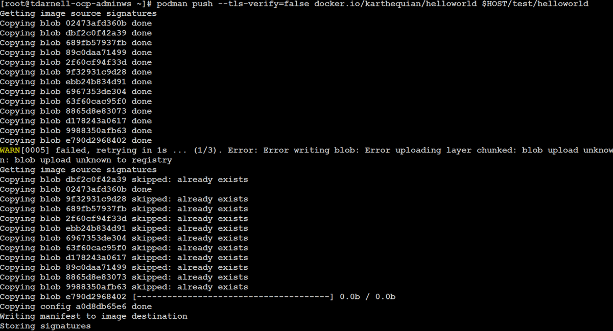 Now that we have our registry exposed, we can get the DNS name by issuing the command oc get route default-route -n openshift-image-registry, then use podman to pull, tag, and push a simple helloworld container image to it:
