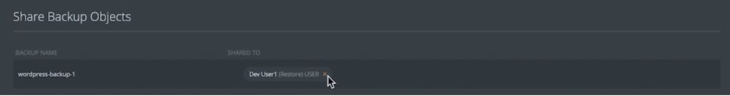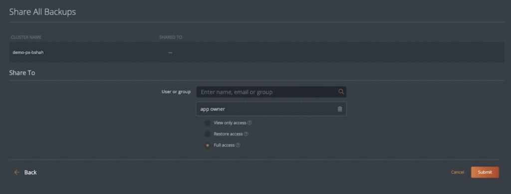 Regardless of who owns the responsibility of managing backups for production applications, you need your data protection solution to be flexible and secure enough that you can share access to backup snapshots without sharing user credentials between different users in your organization. With this latest release of Portworx Backup, we allow users to share the following types of access with individual users and groups: