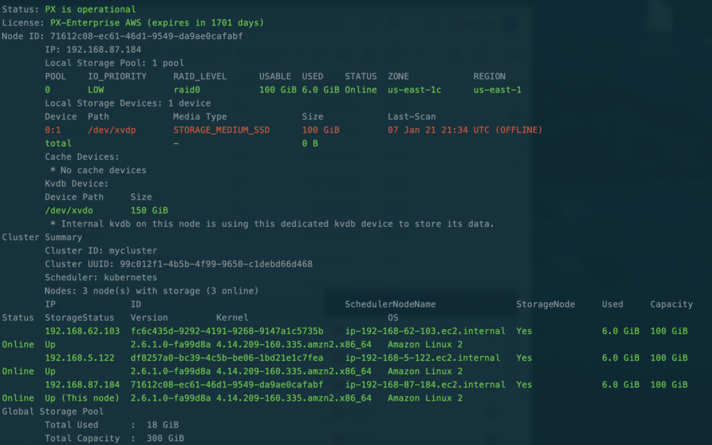 kubectl exec -it $PX_POD -n kube-system -c portworx -- /opt/pwx/bin/pxctl status
