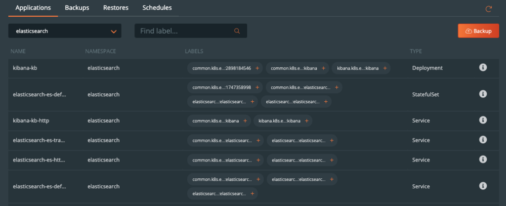 Now that configuration is done and we have created rules for our application, we are ready to start backing up Elasticsearch. What we need to do is enter the backup view of the cluster our service is running in and select the namespace that our application is running in.