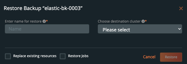 From here you can provide a name for your restore and a destination cluster as well as the following options.