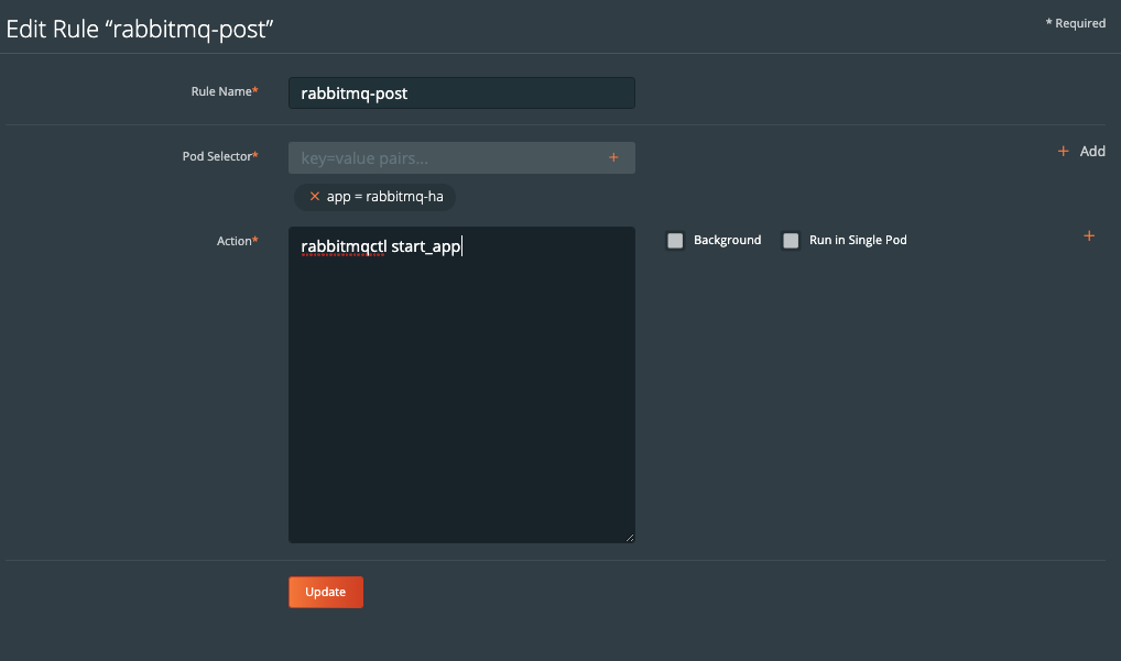 For the pre-exec rule, we’ll set up a rule with two actions. The first action will be to export_definitions to a location within /var/lib/rabbitmq so that the version of definitions for that node will be available with any given restore point