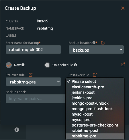 Once you are in the namespace, you can select the labels associated with RabbitMQ to only backup certain objects with the label or backup the entire namespace by selecting the Backup button in the top right corner of the namespace backup view.