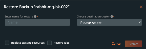 From here you can provide a name for your restore and a destination cluster as well as the following options.