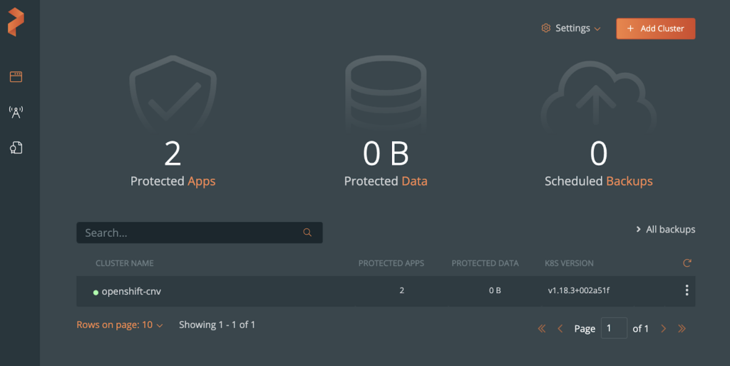 First, add the OCP cluster to PX-Backup by selecting “Add Cluster` at the top right of the PX-Backup interface. In the below image, the cluster we are working with is already added and named “openshift-cnv”.