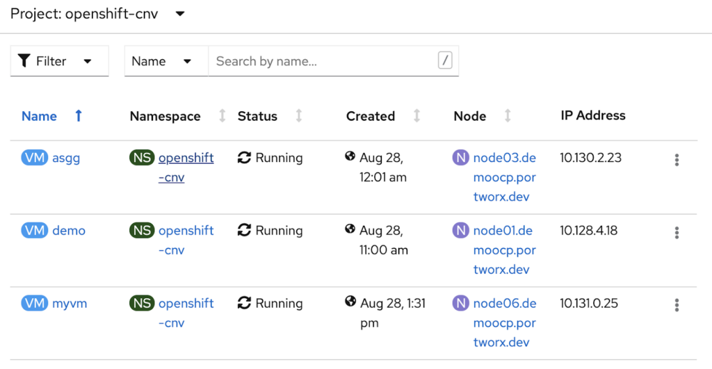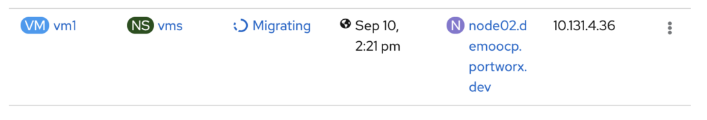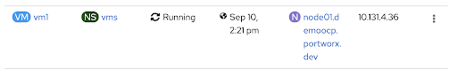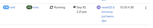 virt-launcher-vm1-x5r9x   0/1     Completed   0          12m   10.131.4.37   node02.demoocp.portworx.dev    <none>           <none>