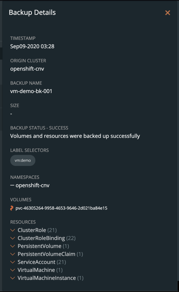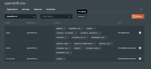 Note, if you have many VMs within a single namespace and you want to backup only one of them, make sure and label the VM resources you need to backup. In this case, I’ve made sure the VM resources and PVCs have a label of vm: demo. Select this label within the PX-Backup UI to backup the needed VM resources.