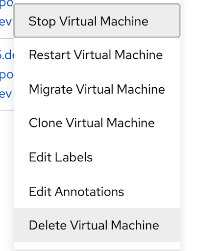 Once your backup is complete, the VM can be deleted to simulate the need to restore a VM. Select “Delete Virtual Machine” from the Openshift VM menu.