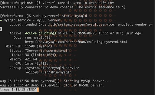Login into the VM console using virtctl and see if MySQL is up and running by running the command systemctl status mysqld.