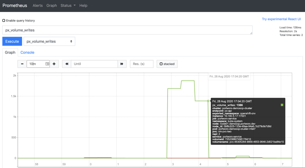We can verify that write operations to the Portworx volume that is attached to our VM by checking Portworx monitoring with Prometheus and selecting the px_volume_writes stat.