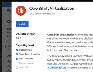 - Install OpenShift Virtualization and CNV operator into your OpenShift cluster. This can be done by installing the OpenShift Virtualization operator from the catalog.