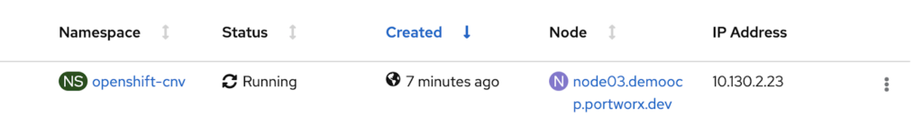 You can verify everything is running properly by listing all pods in the Portworx and openshift-cnv namespace. This indicates that you are ready to create VMs that use Portworx for their storage