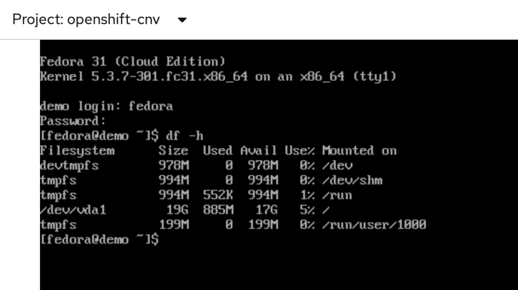 You’ll see that Portworx is providing the VM’s root disk by issuing a df -h command. Confirm it is the same size (20GB) as the original PVC that used CDI to import Fedora.