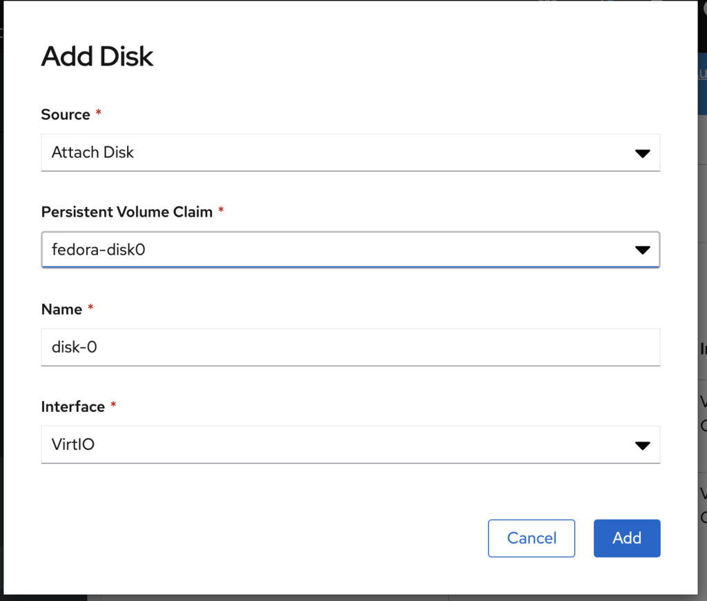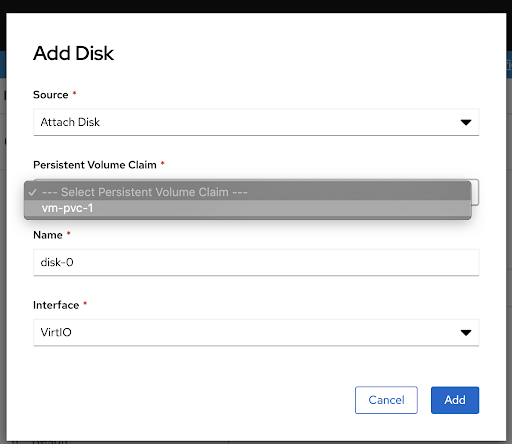 Inside the virtual machine wizard, select the PVC created above in the Storage section to make sure it is attached to the VM when it is created.