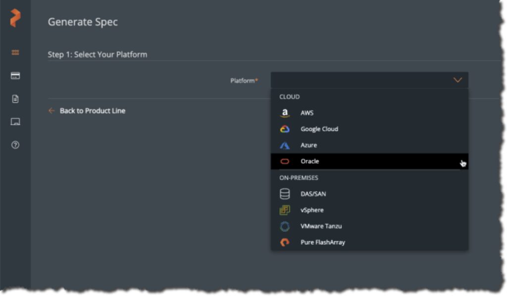 Visit https://central.portworx.com and log on, then select Portworx Enterprise, and then select Portworx Essentials or Portworx Enterprise. We can see the spec generator now includes Oracle as a Cloud option; select Oracle.