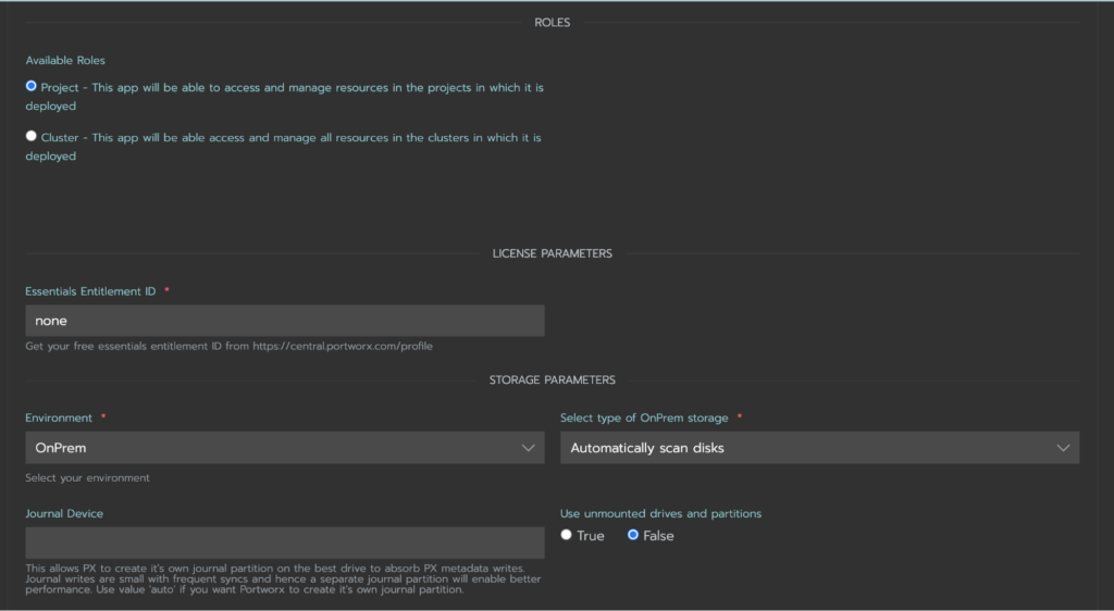Similar to any helm install, you will be required to specify the deployment environment, storage configuration, and other parameters in the Rancher UI to generate the helm chart to install Portworx Essentials. The only new field that you would need to provide is the “Entitlement ID” to activate your Portworx Essentials license.
