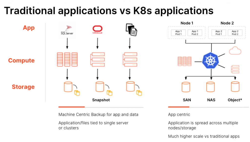Kubernetes backup needs to be aware of the entire application, including Kubernetes objects, namespaces, and configs. Also, Kubernetes allows you to dynamically scale your application to a much higher level than traditional applications. Kubernetes backup products should be capable of handling hundreds or thousands of objects and storage volumes. A traditional application, however, may only be able to handle tens of objects and storage volumes.