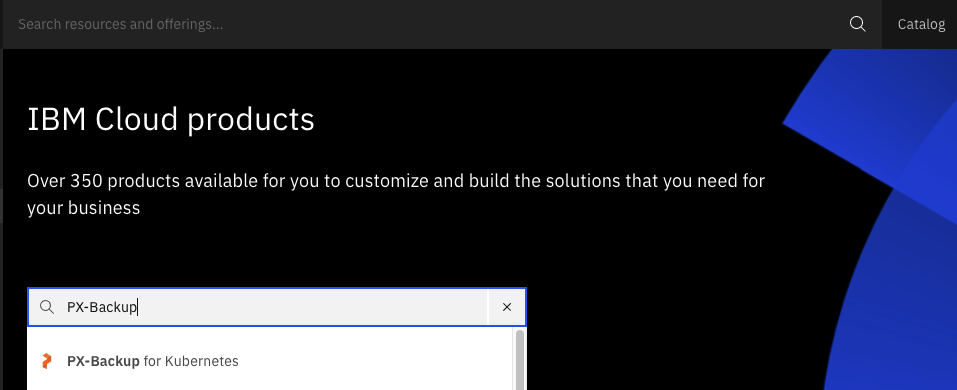 PX-Backup is available as an app in the IBM Cloud catalog. Simply search for PX-Backup and start your subscription.