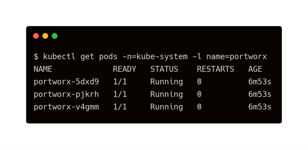 $ kubectl get pods -n=kube-system -l name=portworx NAME READY STATUS RESTARTS AGE portworx-5dxd9 1/1 Running 0 6m53s portworx-pjkrh 1/1 Running 0 6m53s portworx-v4gmm 1/1 Running 0 6m53s