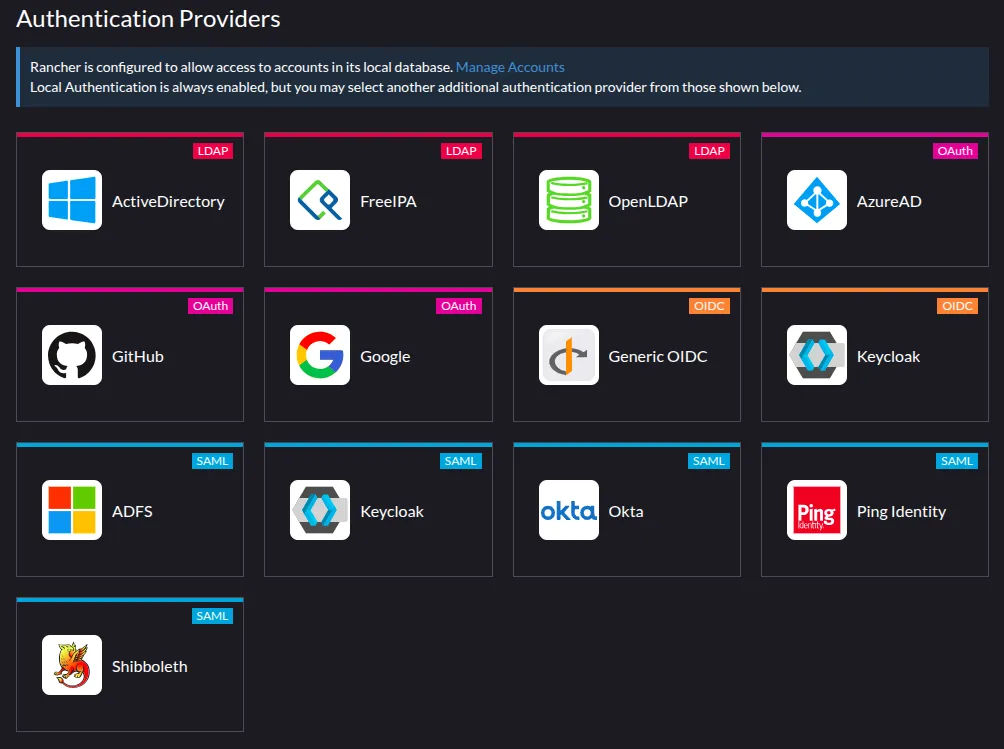 - Access Control and Authentication – Integrates with Active Directory (AD), AzureAD, Google, GitHub, OpenLDAP, and many other identity providers to manage access and roles across clusters.