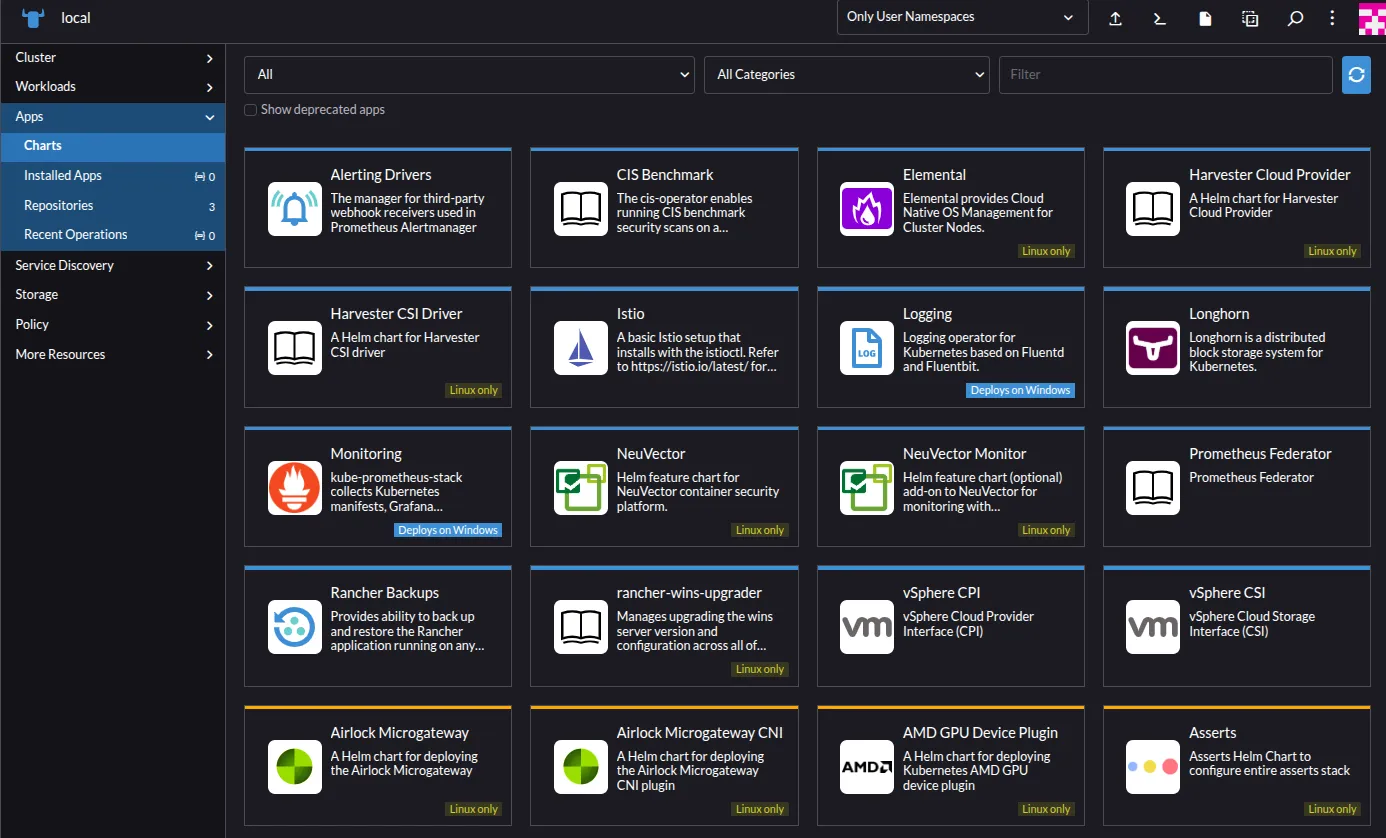 - Application Catalog – Rancher offers an updated app catalog using Helm charts for quick and one-click deployments of applications. Below is a list of some of the Helm charts offered by Rancher as well as partners.